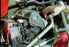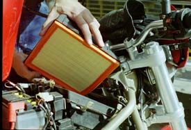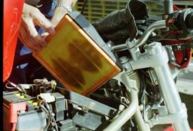 Start by lifting the tank to gain access to the air box. Easy enough.