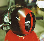 | Here's some pics of my helmet. I did it myself using only a can of red Testors paint and a mask (the frisket used for airbrushing). I first took a compass with two needles, stuck one in where I wanted the center, then lightly scratched the circle onto the helmet (you can't draw on the gelcoat). Then I slowly applied the mask to the circle, left the line through the middle of the logo unmasked, and sprayed the paint very lightly, fading out around it. It went way further than I expected, so i took some Mother's cleaner wax and buffed off the paint I didn't want. It is surprisingly durable, seeing as how I didn't primer it first. It's very subtle and was easy to do, and it looks quite cool from behind. |