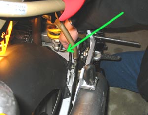 | I'm kind of glossing over all the steps as you may notice, but since this is sort of an advanced operation I have to assume you know how to do all the side ventures. Strip the rear down to gain access to the shock pivot. This includes removing the rear tray and side panels, etc. Then you can start to undo the shock bolts. |