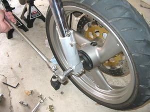 If you've got a 20/17mm solid axle you're probably wondering where the hell I got the 14mm allen socket necessary to get it out. I didn't. I fought with that thing using homemade stuff forever. Then I got a long 9/16" sleeve nut for under $1 (hey- I am cheap, that's been established, but I was also low on time ;). I slightly ground down the sides of one half of it. It slid perfectly into the axle and was loosened using a 9/16" socket in less than 10 seconds. Then unbolt the brake caliper(s) from your forks, slide out the axle, and remove the front wheel.