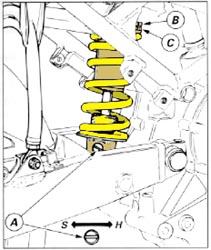 Before undertaking any adjustments, become familiar with the components of the suspension. The piece labeled "B" is the lock ring (nut), the piece labeled "C" is the adjuster ring (nut), and "A" is the rebound damper adjuster. It's also good to know exactly what you're adjusting. "Preload" is just that- a preset tension on the spring, as if there was weight compressing it. If there were no preload, the spring would be way to "springy" and would bounce your suspension to pieces. The suspension needs to be somewhat tight in order to handle well.