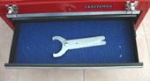 | A shock spanner wrench for setting preload. This model was hard to use, and I wouldn't recommend it. But, it did get the job done. I'd look for one with a longer handle and perhaps a fixed end that is tailored to your Duc's shock so you don't round any edges. This was about $15. |